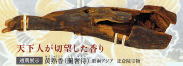 上は後期展示の「紫檀木画槽琵琶」。8世紀頃のもの。下は通期展示の黄熟香=蘭奢待(東・大・寺という字が隠れている)」という香木。 |