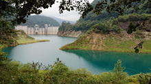 台風シーズン前なので放流して水量を少なくしています。矢印まで水のある春先は湖の色がさらに美しい青になるそうです |