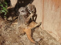 ミーアキャットはマングースの仲間だそうです。目の周りのアイシャドーのおかげでなんだか色っぽい目つきと腰つきでした |