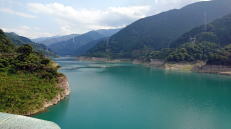 | 四万川ダムのある奥四万湖は美しいコバルトブルーの水が印象的。周囲を時計回りに一方通行の道で走ることができます。 |