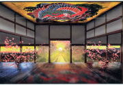 | NTTテクノロジーグループによる、小布施岩松院の天井絵のデジタル化プロジェクト。なんと300億画素という高度の精密デジタル化が実現し、北斎の「八方にらみ鳳凰図」の詳細が明らかになり、また、一般の私達にもごく近くで細部を見ることができるようになりました。北斎の書き残したものから、天井には金箔を貼る予定であったこともわかりました |