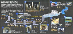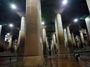 首都圏外郭放水路は左図のようにトンネルと5つの立坑、それに「地下神殿」として知られる庄和排水機場の下の巨大空間からなっています。トンネルは国道16号線の地下50mを走っており、大雨で近隣の河川が溢れないように第2~第4立坑に水を集め、最終的に防災地下神殿に流れ込みます。水槽の大きさは長さ177m幅78m高さ18m。最大670000㎥の泥と水を溜めることができ、4台の巨大排水ポンプで江戸川に排水します。通常の大雨なら第4立坑までの貯水で事足りますが、年に平均7回ほどは地下神殿にも水が来るそうです。内部はライトアップが美しく、59本の巨大なコンクリートの柱がまるでパルテノン神殿のよう、というので「地下神殿」と呼ばれるようになりました |