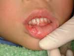 そしてそれより多いのが「歯ごたえが気持ちよくて唇を咬んで遊ぶ」こと。唇は、ちょうどグミキャンディのような歯ごたえがあって咬んだり吸ったりすると気持ちいいらしいのです。治療後30分から1時間ほどは咬む食べ物をひかえ、(飲み物は大丈夫)、こちらで差し上げるロール綿か、ハンカチかタオルをくわえさせておいてください。 |